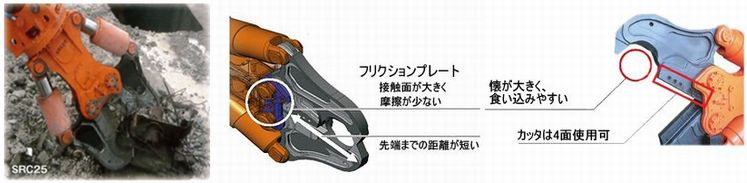 | 型 式 | 適合ショベル(m3) | 質量(kg) | 最大開口幅(mm) | 先端破砕力(kN) | 中央破砕力(kN) | カッター刃(mm) | 使用圧力(Mpa) |