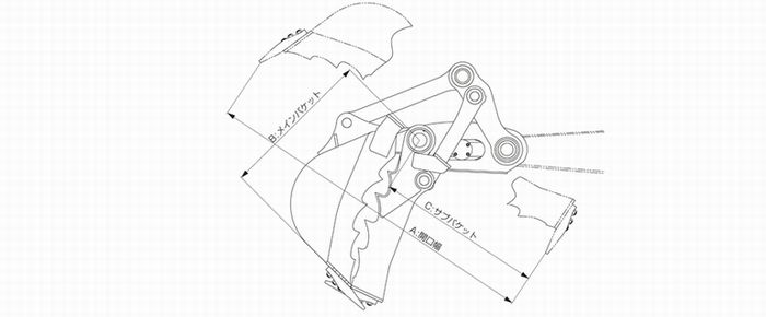 | 型 式 | 適応クラス | A:開口幅(mm) | B:メインバケット(mm) | C:サブバケット(mm) | バケット幅(mm) | 重量(kg) |