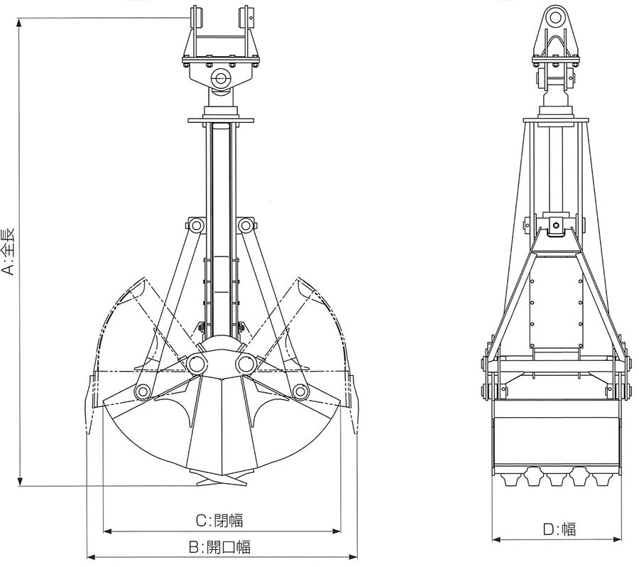 | 型 式 | 適応クラス(ton) | A:全長(mm) | B:開口幅(mm) | C:閉幅(mm) | D:幅(mm) | 質量(Kg) |