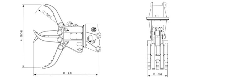 型 式 適応クラス(m3) 開口幅(㎜) 全長(mm) 爪長さ(mm) 爪幅(mm) 質量(Kg)