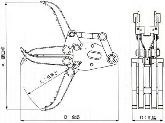 | 型式 | 適応クラス (ton) | A:開口幅 (mm) | B:全長 (mm) | C:爪長さ (mm) | D:爪幅 (mm) | 質量 (kg) |