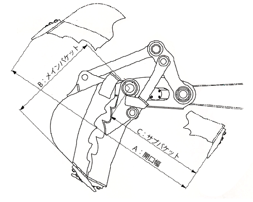 | 型式 | 適応クラス (ton) | A:開口幅 (mm) | B:メインバケット (mm) | C:サブバケット (mm) | D:バケット幅 (mm) | 質量 (kg) |