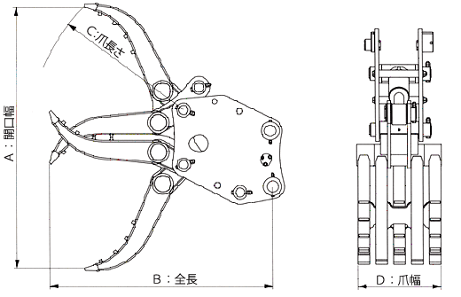 | 型式 | 適応クラス (ton) | A:開口幅 (mm) | B:全長 (mm) | C:爪長さ (mm) | D:爪幅 (mm) | 質量 (kg) |
